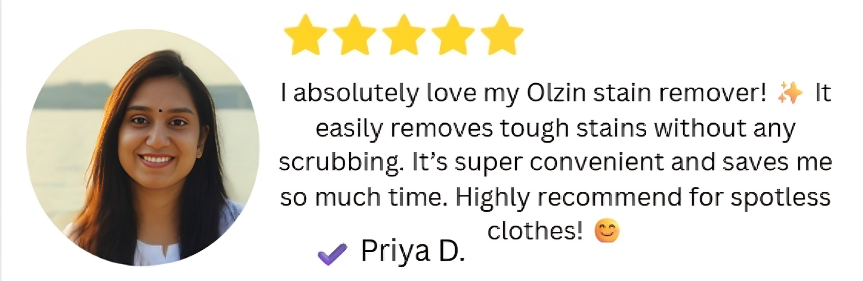 “My kid spilled turmeric on a white shirt. One wash with Olzin, and it’s like new!”